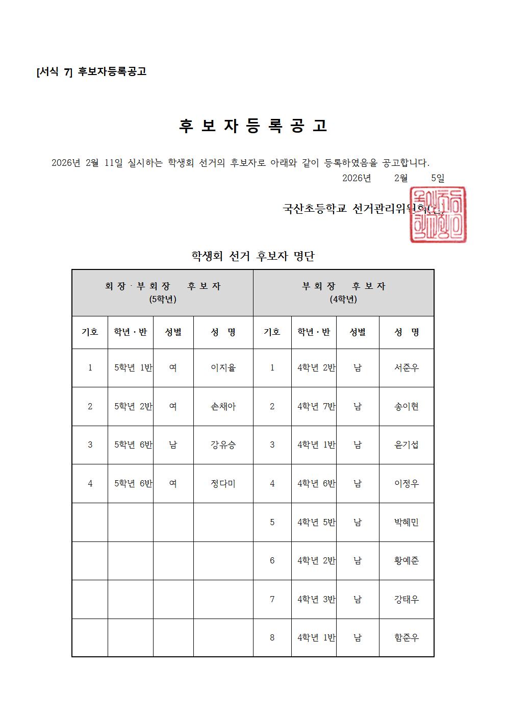 2026학년도 학생자치회 임원 후보자 등록 공고(후보자 명단 및 기호)문을 첨부합니다.