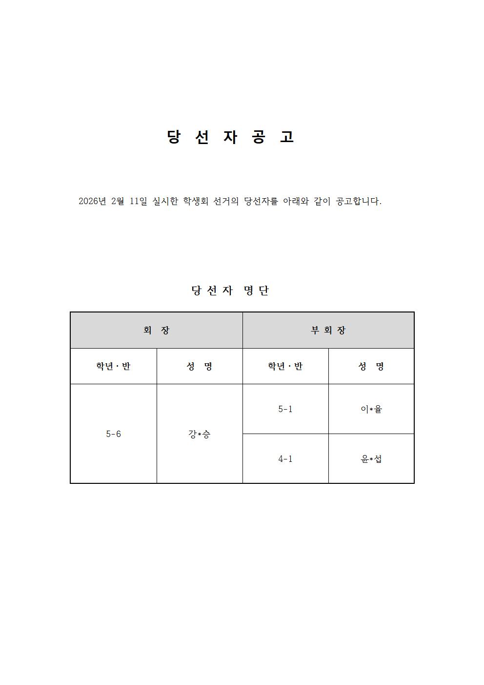 2026년도 학생자치회 전교임원 선거 당선자 공고