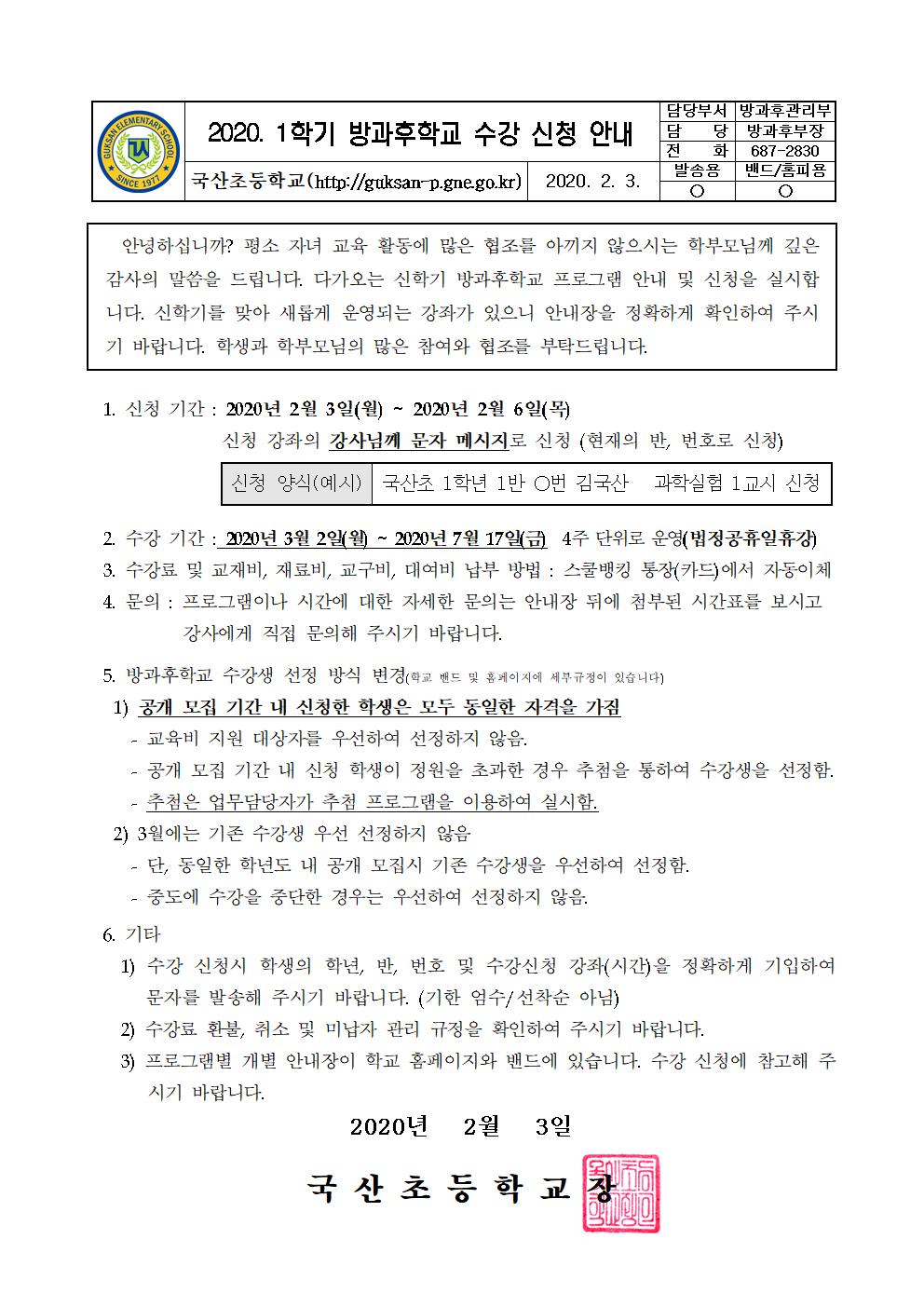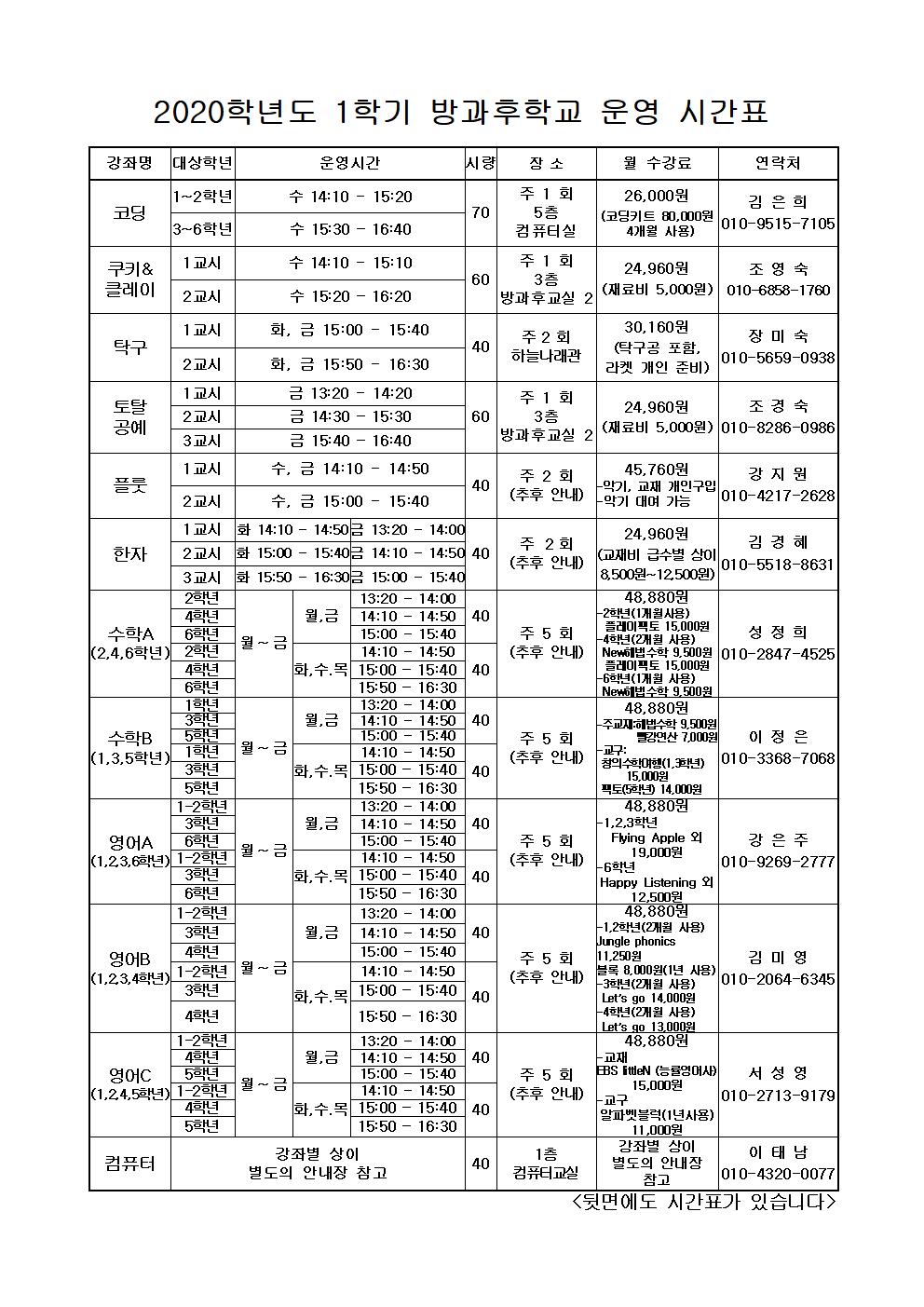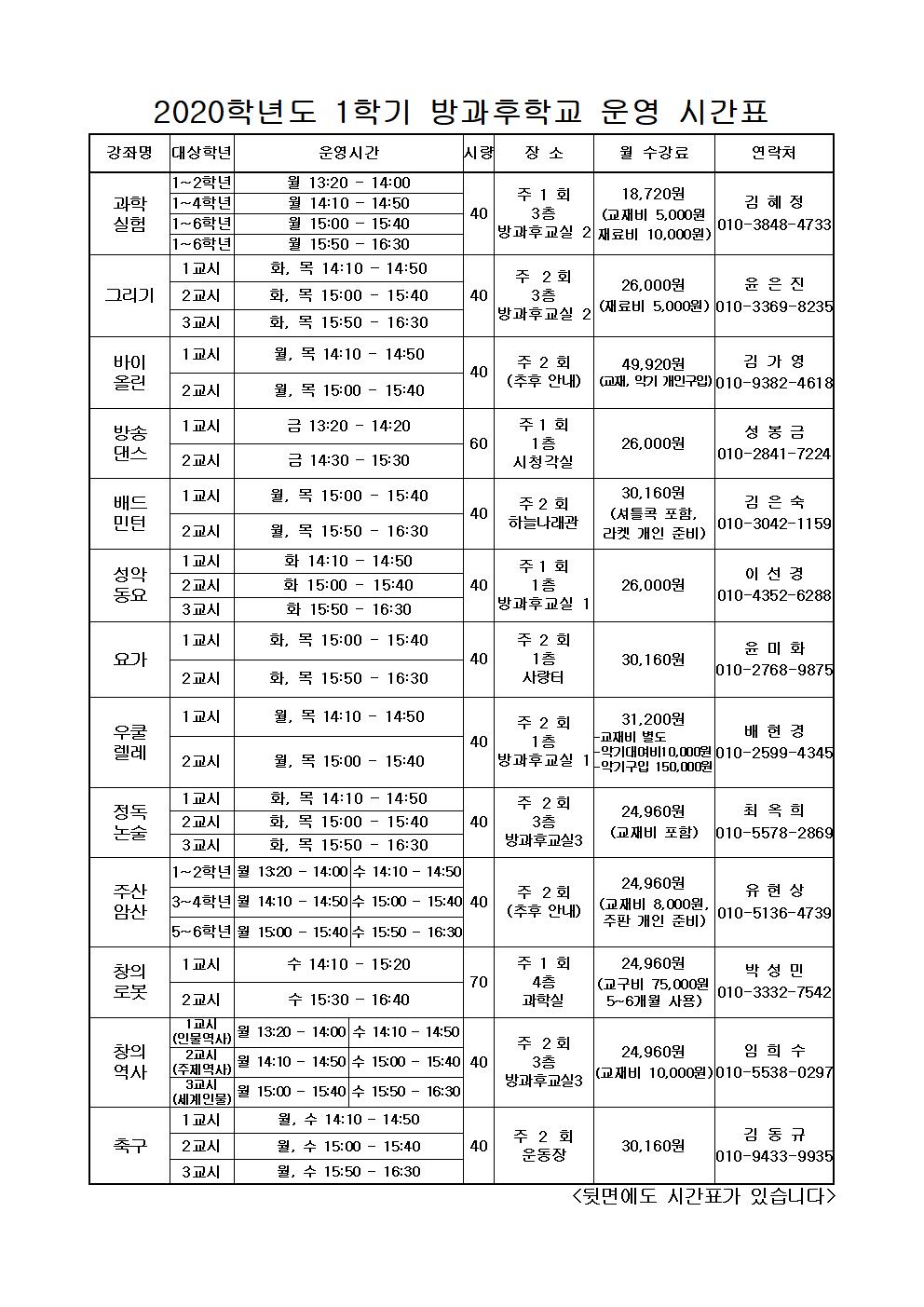 2020학년도 1학기 방과후학교 운영 및 신청 안내