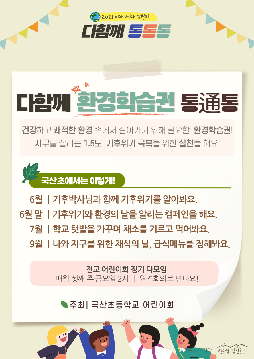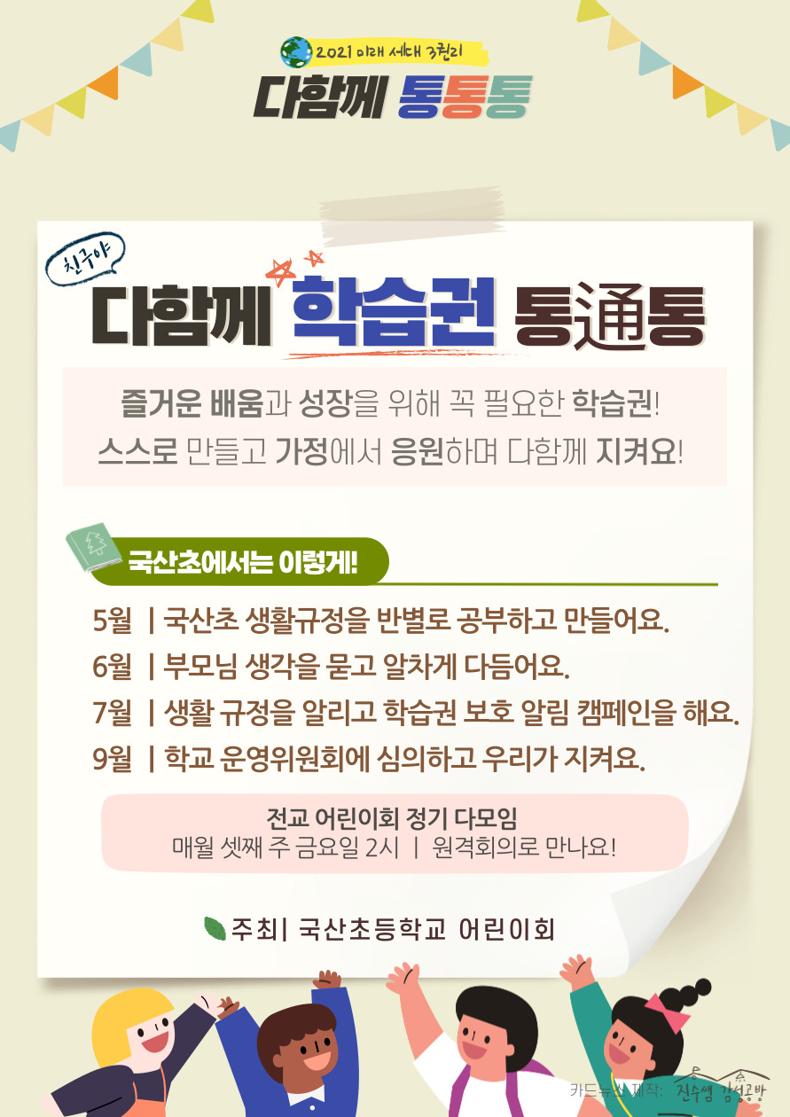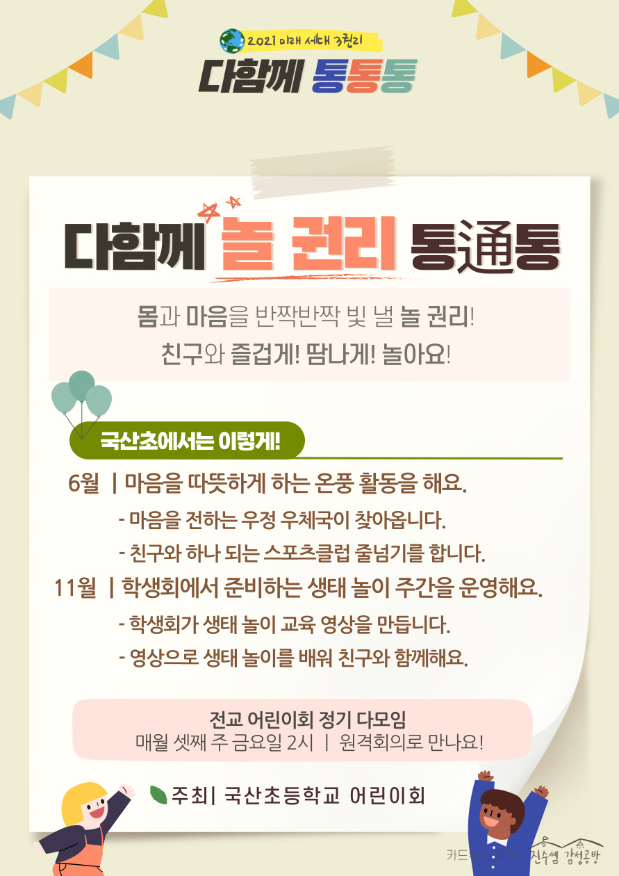 국산초등학교 전교 어린이회가 중심이 되어 학생들의 '학습권, 놀권리, 환경권'을 신장하는 프로그램을 구성하여