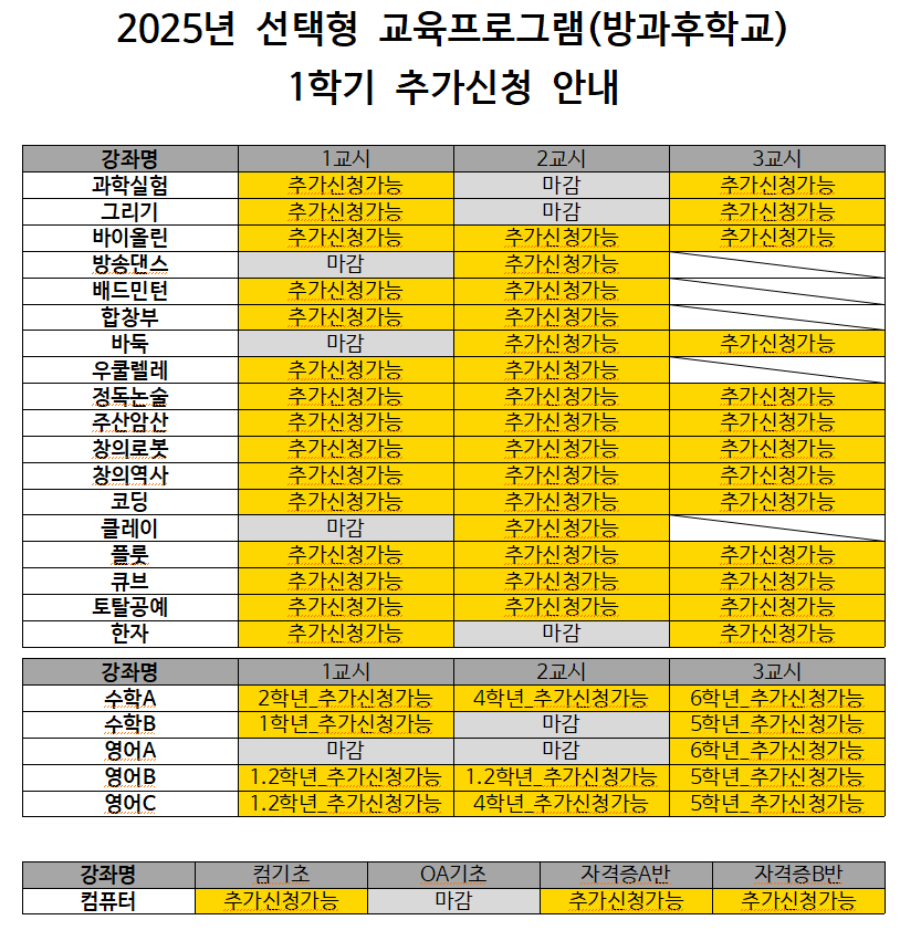 학부모님, 안녕하십니까?현재 수강 신청이 가능한 2025년 선택형 교육프로그램(방과후강좌(정원 미달 강좌))를 아래와 같이 안내드립니다.아래 추가 신청 가능 강좌를 확인 후 강사님께 직접 신청 해주시면 됩니다.관심있으신 학부모님들의 많은 참여 부탁드립니다.※정원 마감시까지 선착순 신청