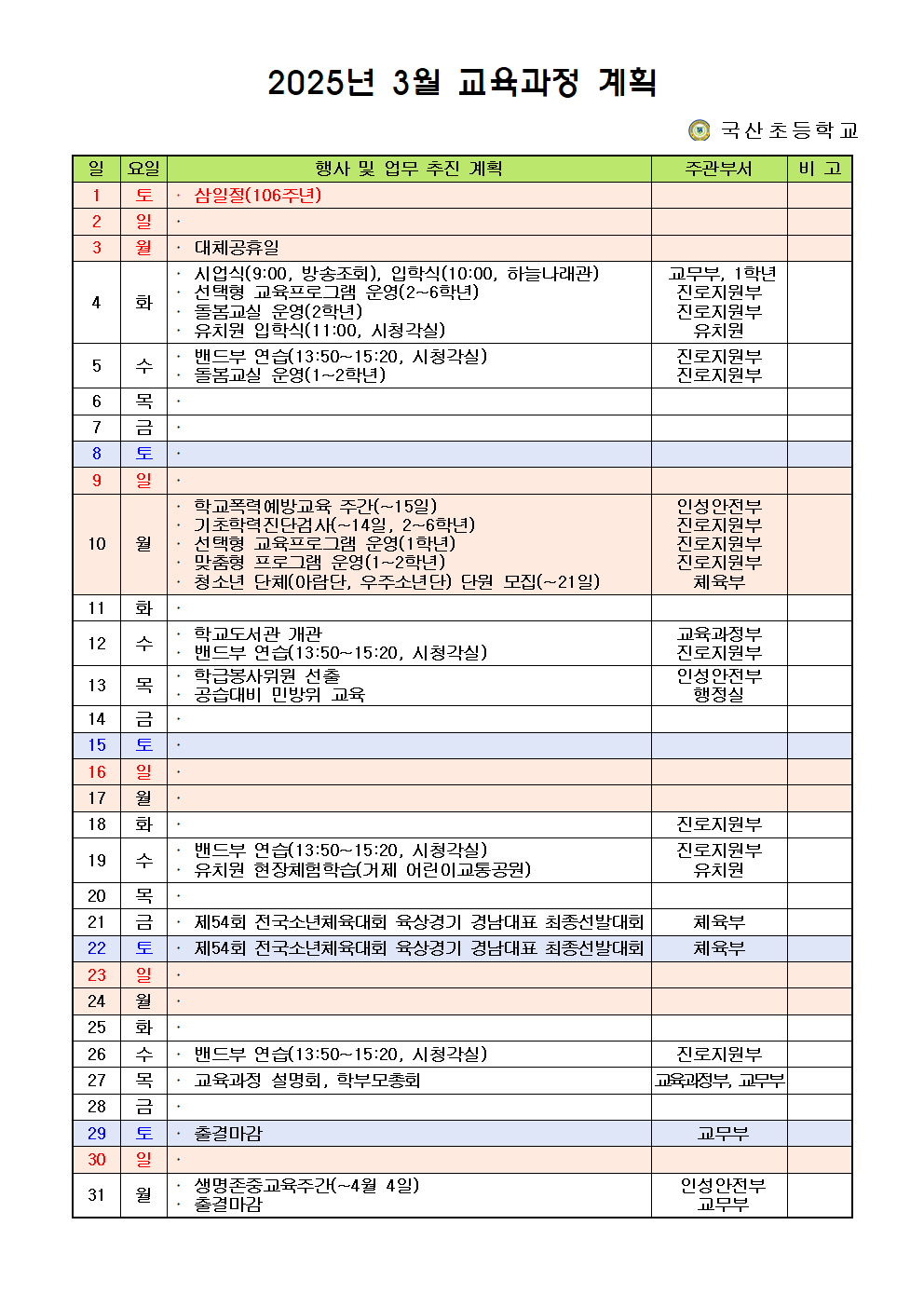 2025.국산초 학사일정