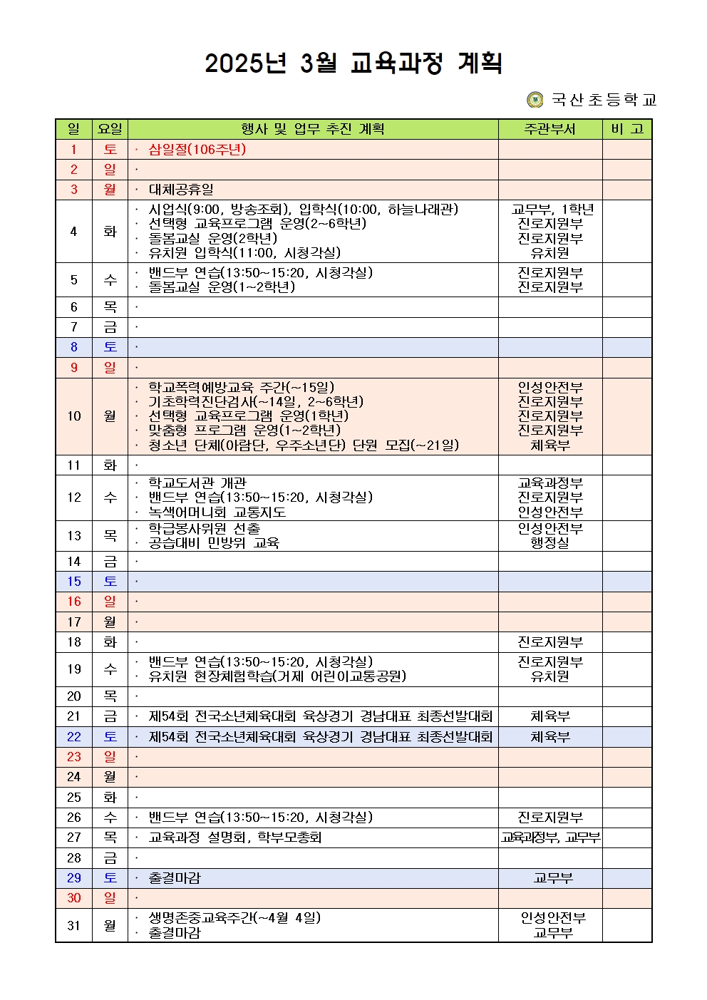 녹색어머니회 교통지도 일정이 추가된 3월 교육과정 계획 새롭게 알려드립니다.