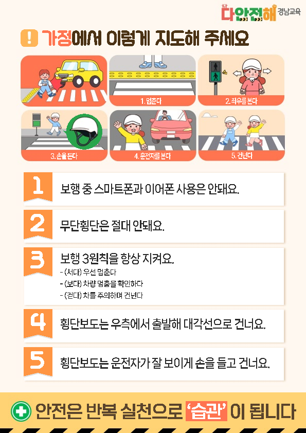 '다안전해 경남교육'은 학교안전교육의 장을 가정으로 확대하여 교육공동체 모두의 안전의식을 높이고, 지식 중심에서 나아가 직접 실천해 보는 체험형 안전교육으로 생활 속 위험 상황에 대비하는 경남교육청의 안전 소식지입니다. 가정에서도 아래 내용을 주의깊게 살펴보시고 생활 속 위험 상황에 대처할 수 있도록 지도 부탁드립니다.