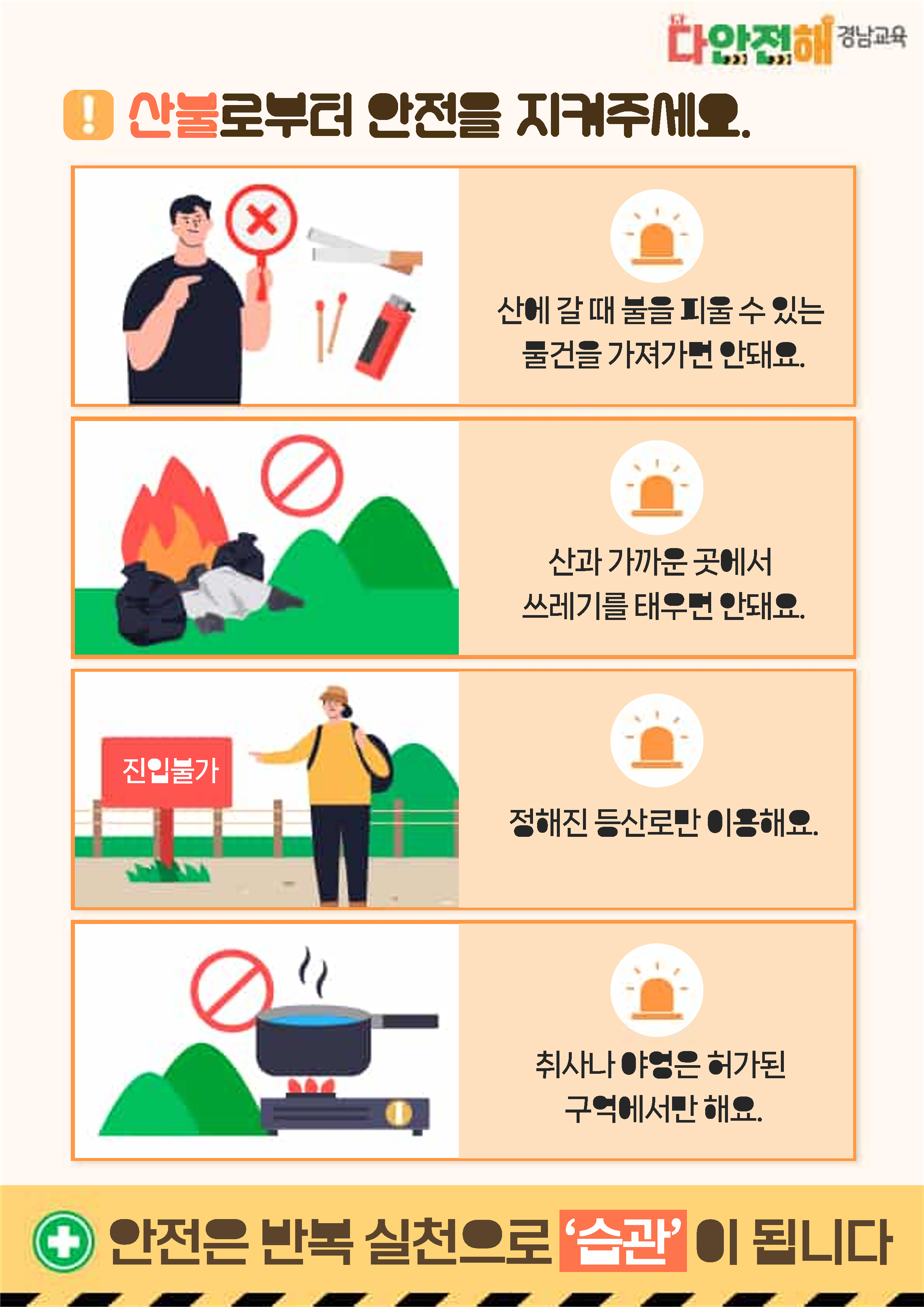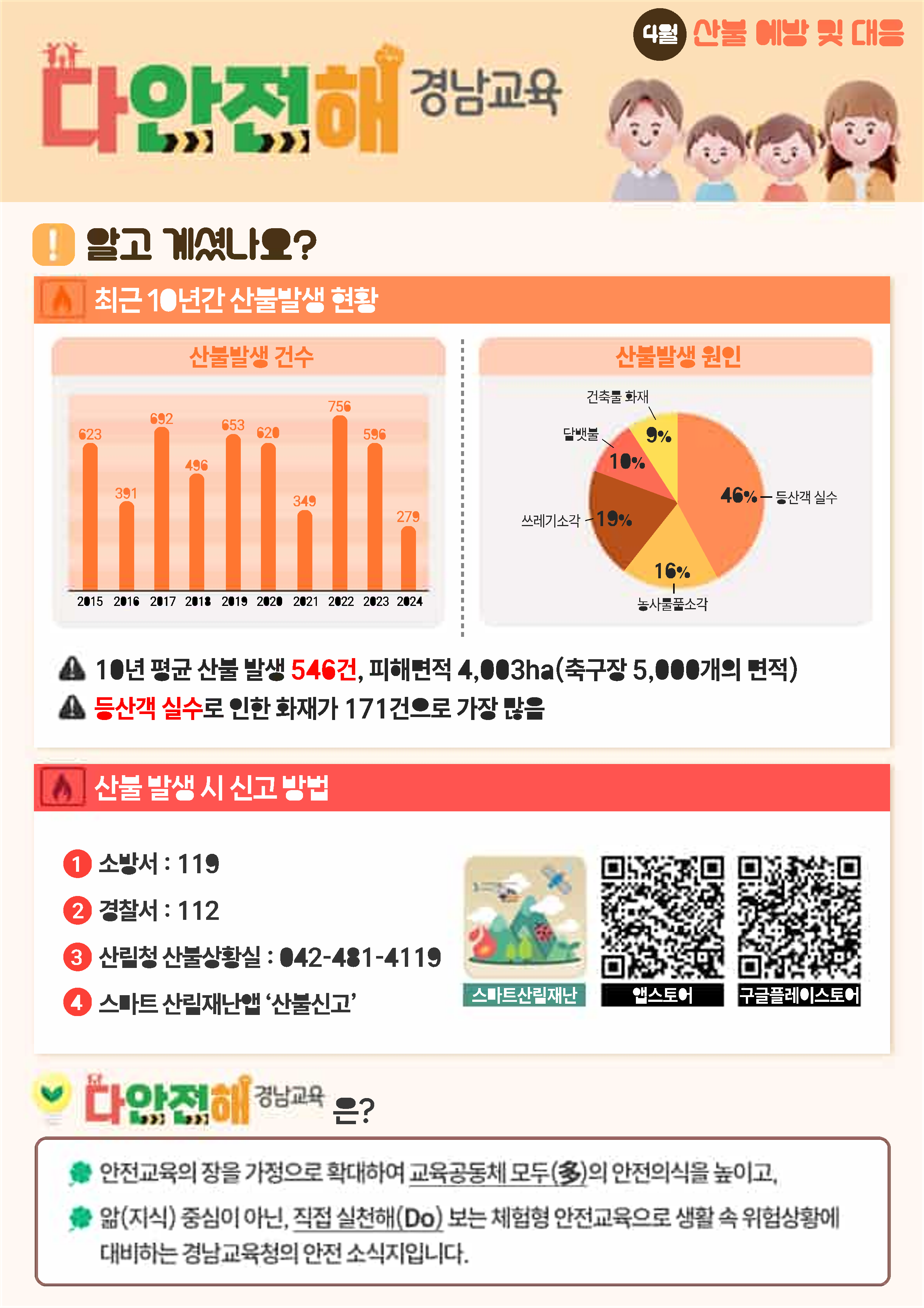 '다안전해 경남교육'은 학교안전교육의 장을 가정으로 확대하여 교육공동체 모두의 안전의식을 높이고, 지식 중심에서 나아가 직접 실천해 보는 체험형 안전교육으로 생활 속 위험 상황에 대비하는 경남교육청의 안전 소식지입니다. 가정에서도 아래 내용을 주의깊게 살펴보시고 생활 속 위험 상황에 대처할 수 있도록 지도 부탁드립니다.